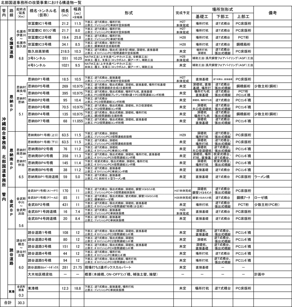 道路整備については、県内最大の集客力を誇る本部町の「美ら海水族館」や観光リゾート地域である恩納村など多数の観光資源・施設を有する地域を抱えていることから、観光シーズンやイベント時などに発生する交通渋滞の緩和に加えて、観光の支援、地域の活性化を目的とした改築事業(地域高規格道路名護東道路、地域高規格道路読谷道路、恩納・恩納南BP、金武BP)を進めているところです。