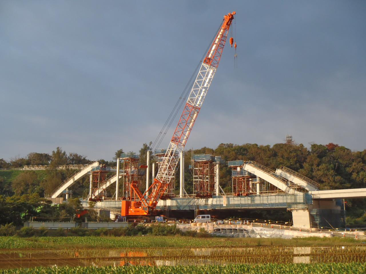 2工区の構造物比率は70%で、残区間でもトンネル2本、橋梁5橋を予定しています。3号トンネル(551㍍)が貫通済みで、4号トンネル(1021㍍)は用地買収を進めており工事は未発注です。橋梁は世冨慶IC関連で4橋あり、2橋が完成、世冨慶IC2号橋(プレテンPCT桁)が上部工施工中で、同3号橋(鋼箱桁)が今後発注予定です。長大橋としては3、4号トンネルの間に数久田高架橋(218.5㍍、ポステンPCホロー桁)があります。現在は下部工を施工中です。