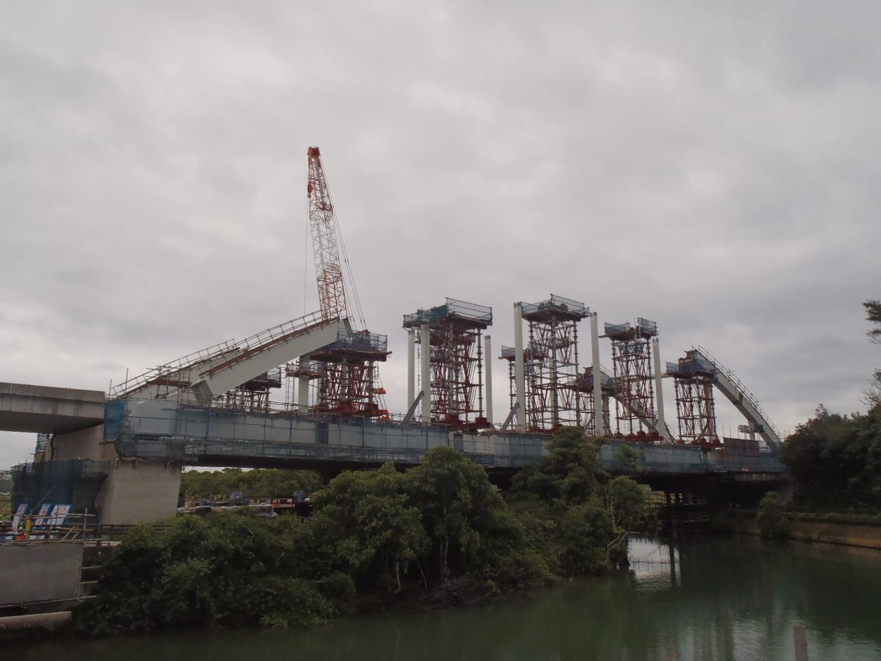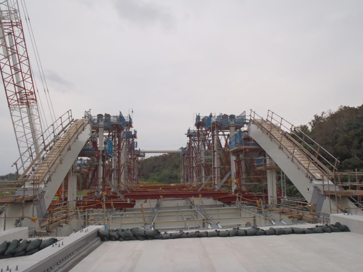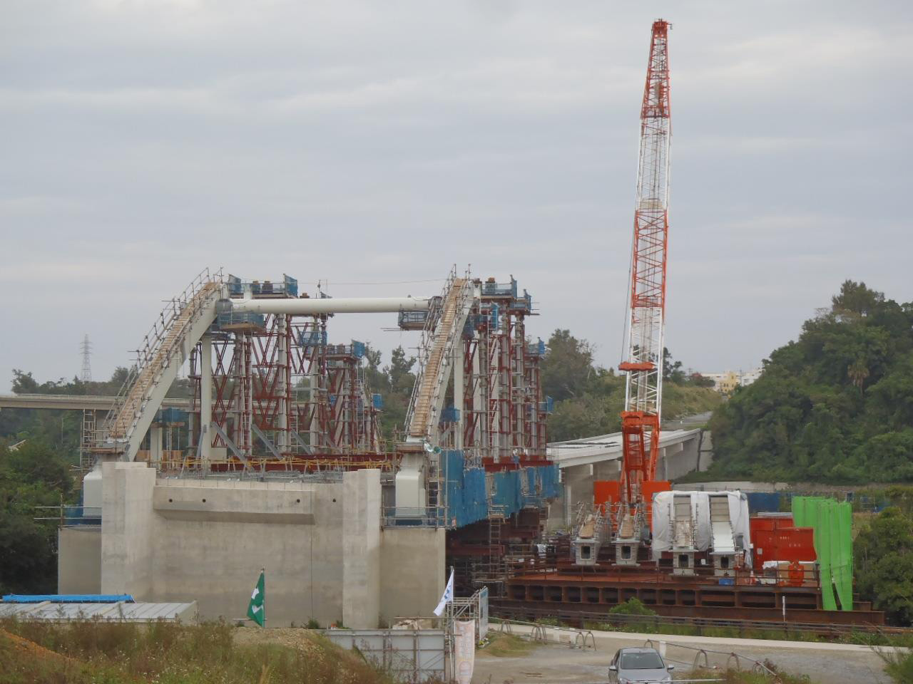 構造物は4橋予定しており、金武BP1号橋(255㍍、プレテンPC4+3径間連結床版桁+鋼単純ローゼ桁)は上部工架設を完了しています。また金武BP1号跨道橋(16㍍、プレテン単純T桁)も今年度完了する予定です。残りは2橋ありますが、最長の2号橋(431㍍、ポステンPC4径間連結T 桁)については、P2橋脚を除いて下部工を完成しており、用地の問題でP2のみ着手できない状況が続いていましたが、このほど解決しましたので、今年度P2橋脚工事に着手し、完成次第上部工に入っていきたいと考えています。また、金武BP4号跨道橋(20㍍、プレテンPC単純桁)についても工事を進めています。