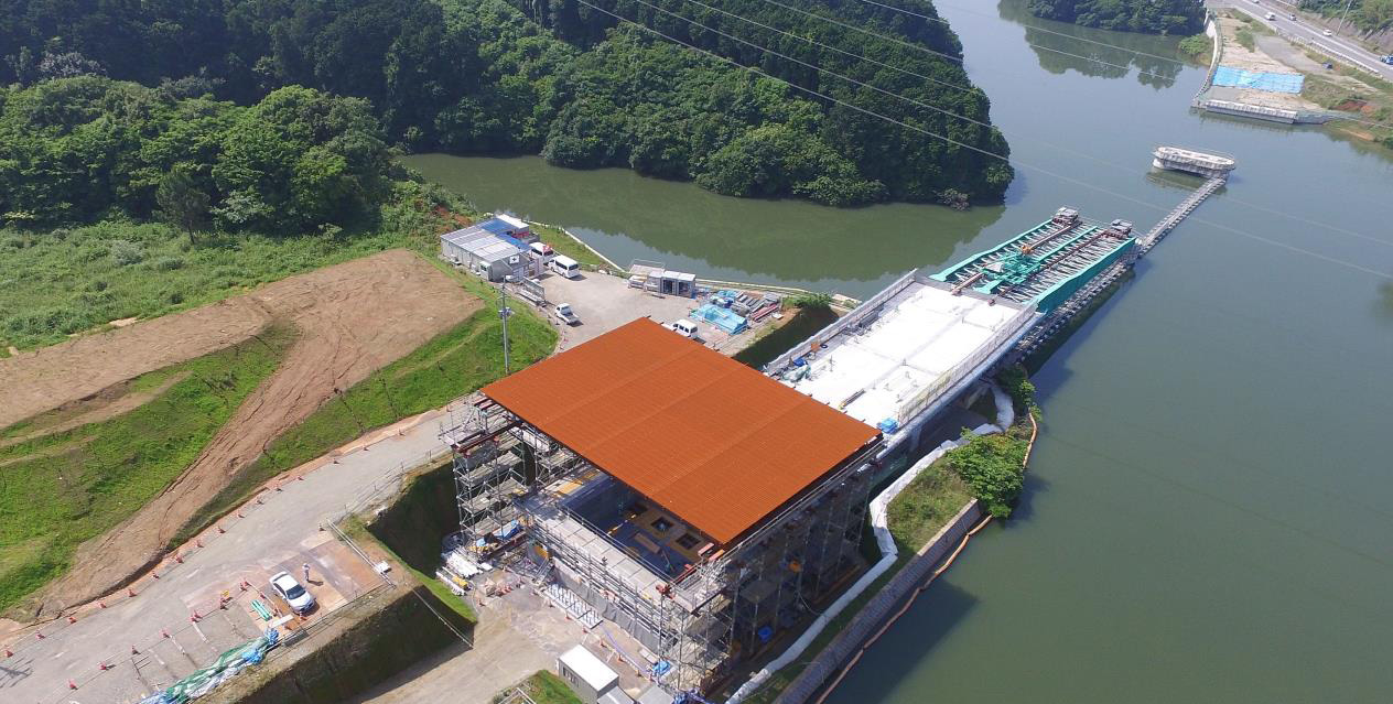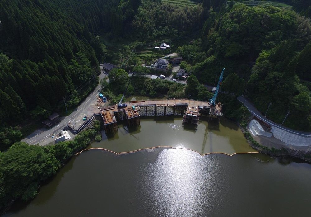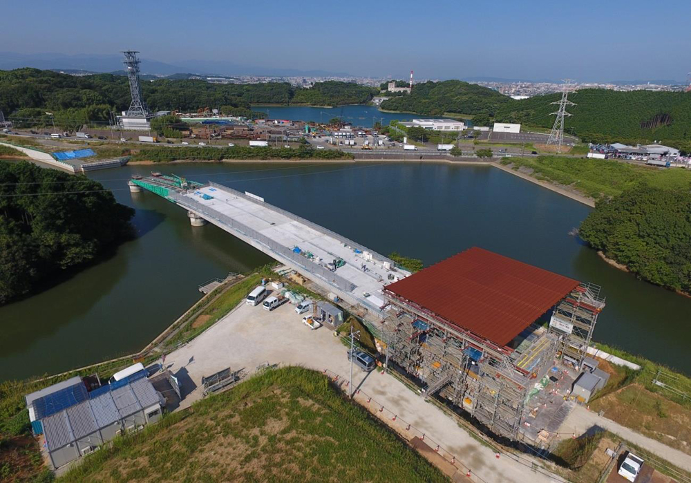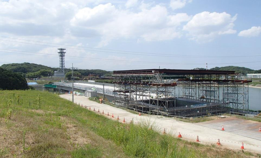 野瀬 新大間池橋(仮称)は、農業用ため池を渡る、橋長175㍍、幅員15.25㍍の3径間連続PC箱桁橋です。架設工法は、上空に高圧線が架空されていること、ため池の貯水阻害を最小限にする必要があることから押出架設工法を採用しています。下部工は、締め切りが不要なPCウエル工法を用いています。現在、上部工の架設が進んでおり、橋梁本体は平成29年3月の完成を目標に工事を進めています。