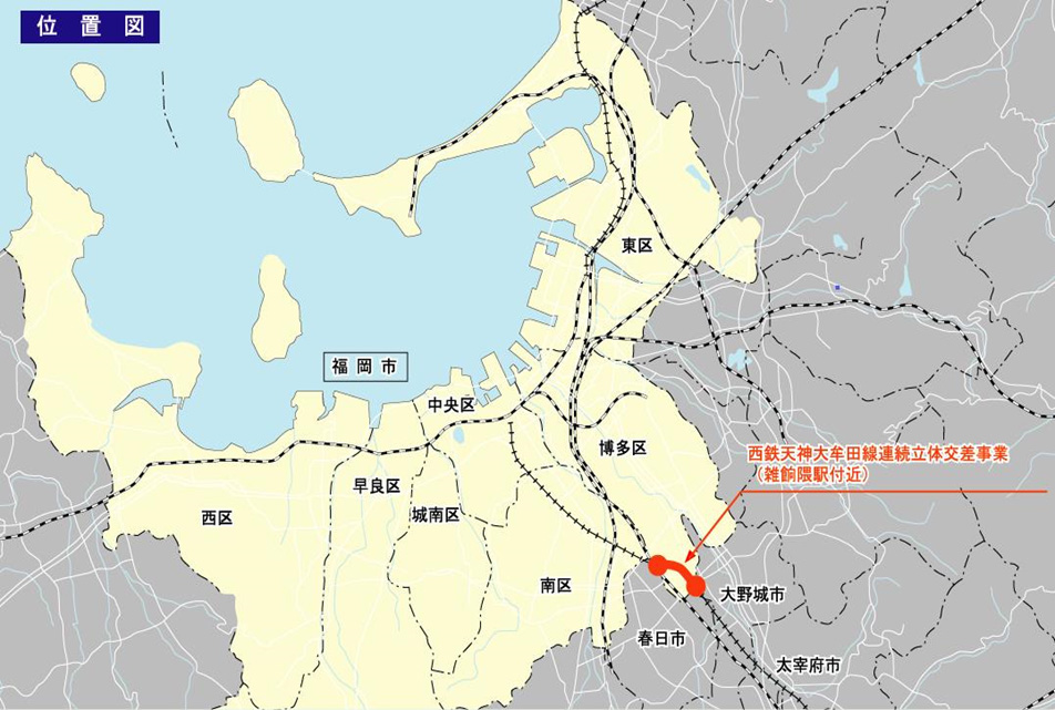 西鉄天神大牟田線の雑餉隈駅付近は、福岡市南部の地域拠点と位置付けられています。しかし、多くの踏切があることで慢性的な交通渋滞や重大な踏切事故が発生し、また鉄道による地域の分断など、安全で快適なまちづくりを行う上で大きな支障となっています。