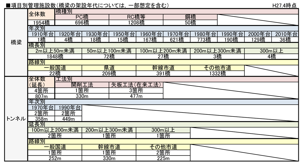 路線別では、国道が22橋、県道が209橋、幹線市道が391橋、その他市道が1、332橋となっています。