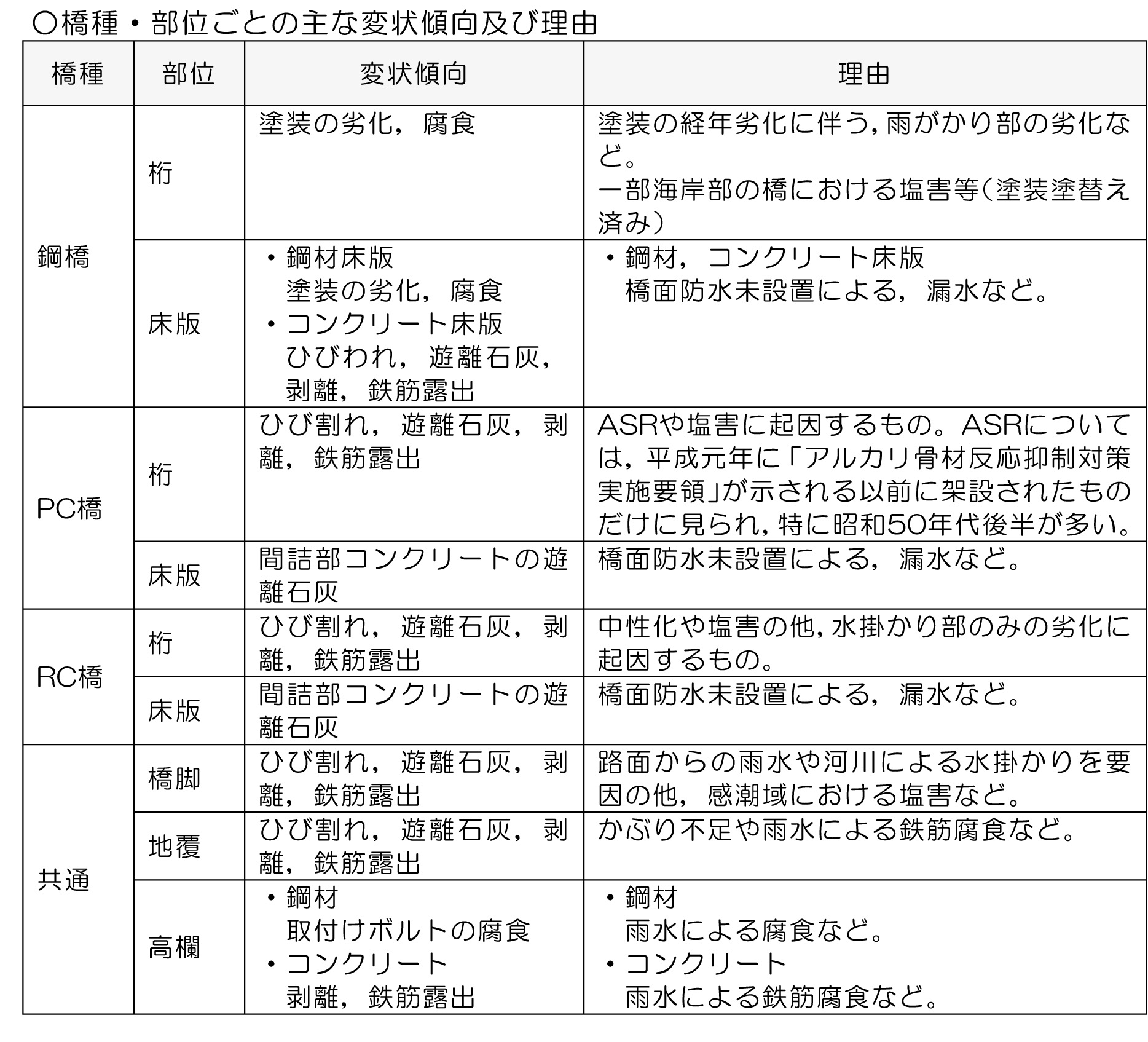 変状の傾向・理由としては、福岡市の管理橋はコンクリート橋が9割以上を占めており、特に主桁・下部工のひび割れ・鉄筋露出といった3大劣化(中性化、塩害、ASR)が要因となるものが多くなっています。