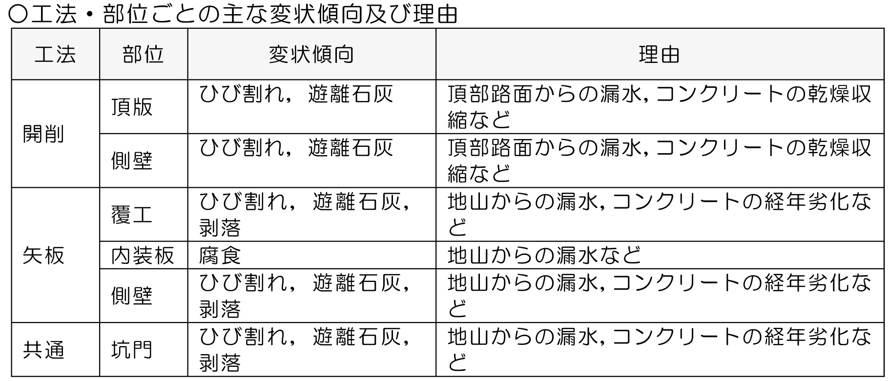 コンクリート部ではひび割れや遊離石灰、内装板等の鋼材部では腐食といった漏水などを原因とした変状が多くみられます。