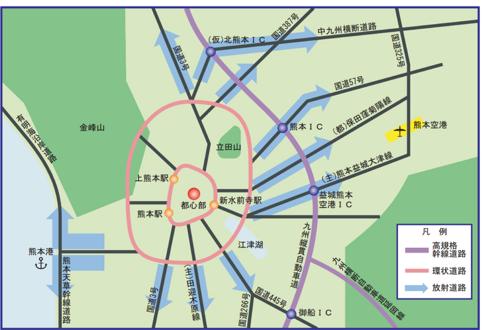 具体的には2環状11放射道路の整備を目指しています。熊本では都市圏環状道路がうまく整備されておらず、市内は非常に渋滞が多く発生しています。この2環状がきちんと機能するようになりますと、都市内の渋滞というのは減ってくると思いますし、11の放射状道路が市と隣接する地域、ひいては九州各地とスムーズに結んでいく、コンパクト+ネットワークを実現できます。現在は、熊本市が主に事業を進めていますが、国の方にも事業の分担をお願いしており、連携しながら道路ネットワークを作っていきたいと思っています。
