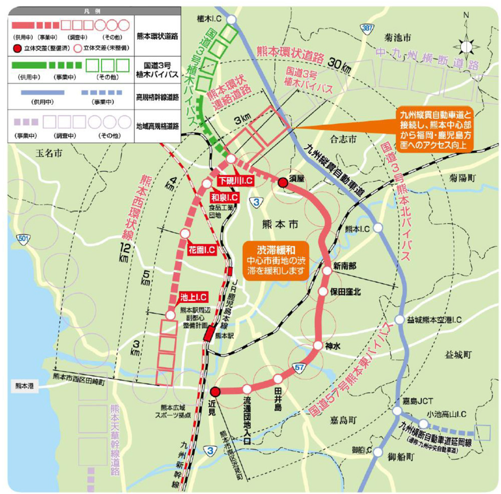 西環状道路を作ることで、例えば九州縦貫道であれば、植木ICで降りて国道3号を南に下る、あるいは整備中(一部、暫定2車線供用している)の植木バイパスを活用して西環状の方に入ることで熊本の中心市街地に入ることができ、市全体の交通渋滞の緩和に寄与できると考えています。