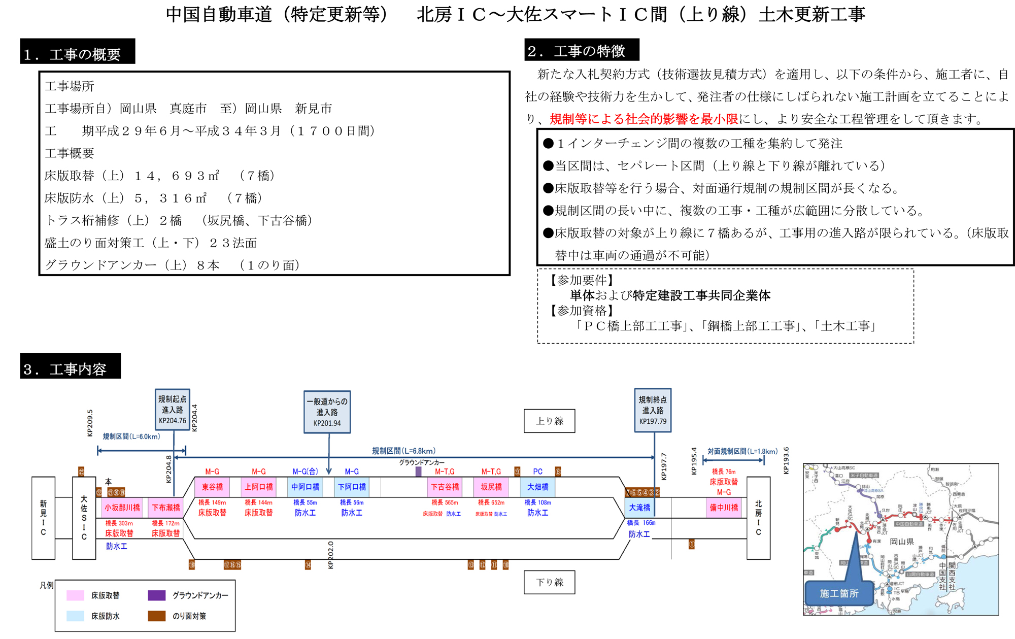 11月末に公告した中国自動車道(特定更新等)北房IC~大佐スマートIC間(上り線)土木更新工事で新契約方式を試行しました。インターチェンジ間の複数の工種を集約して発注するものです。当区間は、セパレート区間になっており、床版取替などを行う場合、対面通行規制の規制区間が長くなることに加え、長い規制区間の中に様々な異工種が広範囲に分散しています。さらに床版取替の対象橋が上り線側に7橋あるのですが、工事用の進入路が限られています。