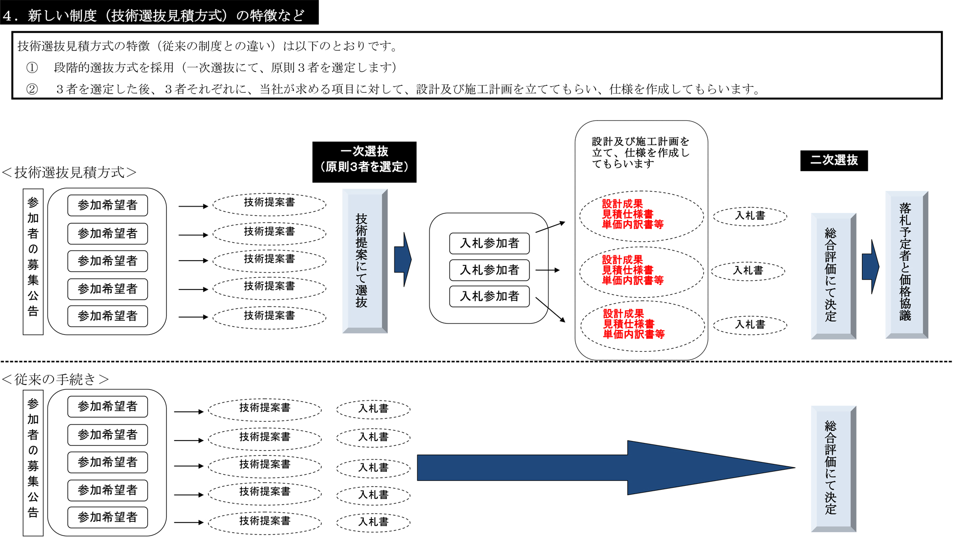 こうした条件から、施工者に、自社の技術力を生かして発注者の仕様にしばられない施工計画を立てることによって社会的影響を最小限にしつつ、より安全な工程管理をしてもらうことを目指します。また、広い工事区間の中で、多工種・複数の工事を同時に行うため、施工者に工事全体のマネジメント(工程管理、連絡調整、リスクマネジメントなど)に関する高度技術提案を求めるものです。そうした提案を総合評価して受注者を選定することを考えています。