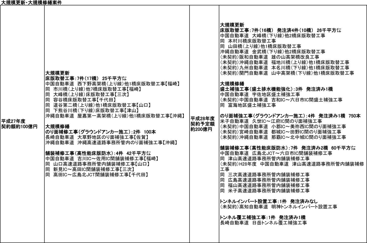 なお個別の規模感で申し上げますと、床版取替が平成27年度25,000平方㍍、28年度26,000平方㍍、法面補強工事がグラウンドアンカー施工で27年度100本、28年度750本、高性能床版防水工が27年度42,000平方㍍、28年度60,000平方㍍となっています。