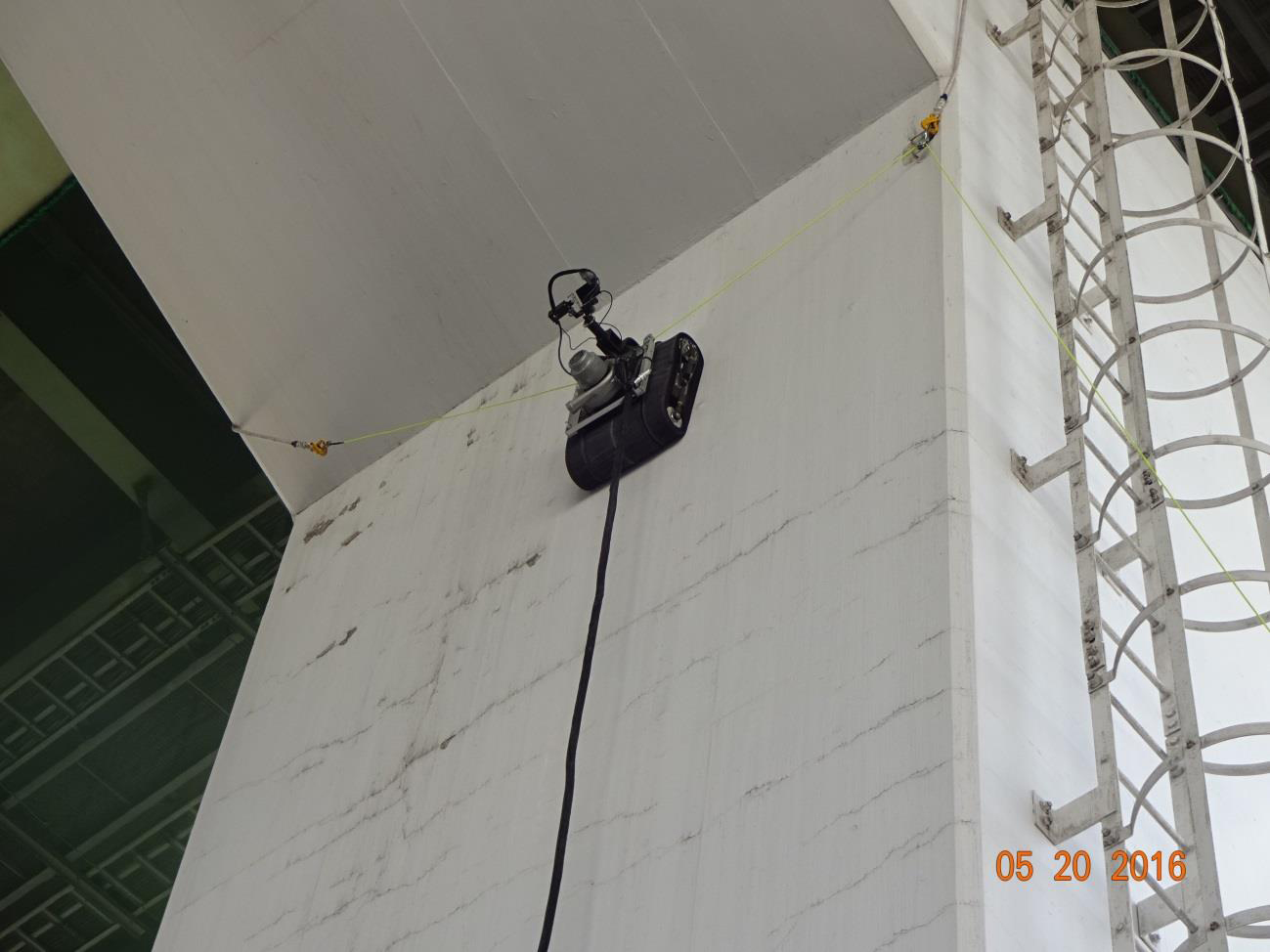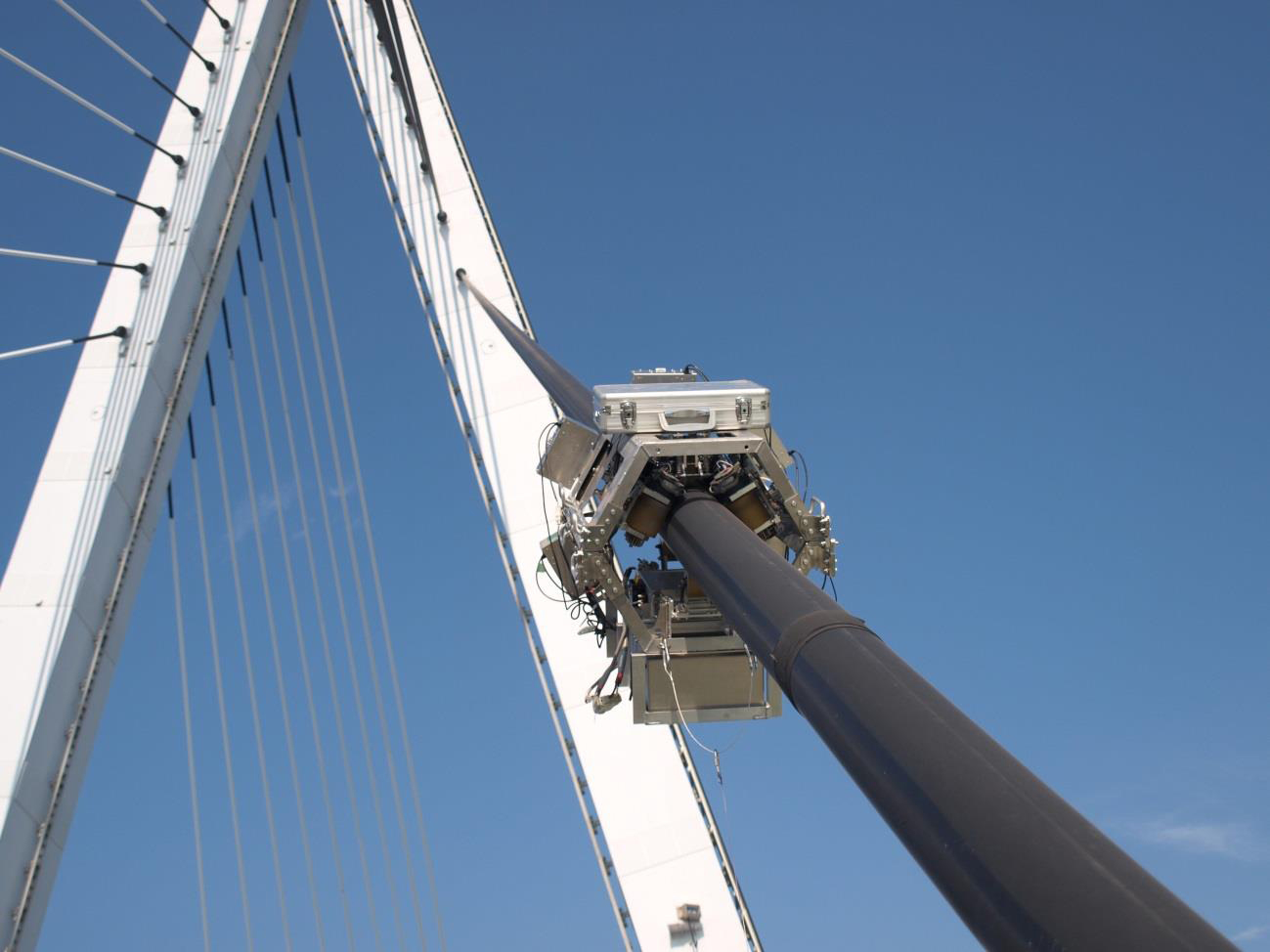 また斜張橋のケーブルを点検する非破壊検査技術として「ケーブル点検ロボット※1」を開発しており、天保山大橋のケーブル点検で採用しました。平成26年7月の道路法の省令改正で5年に1回の近接目視点検が義務付けられたことで、斜張橋ケーブル点検において従来の高所作業車から遠望目視点検を行っていた方法に代わるもので、1秒あたり約30㌢の速度で上昇することが可能です。1ケーブルにつき10分~15分でケーブル被覆材の損傷を検出することができます。