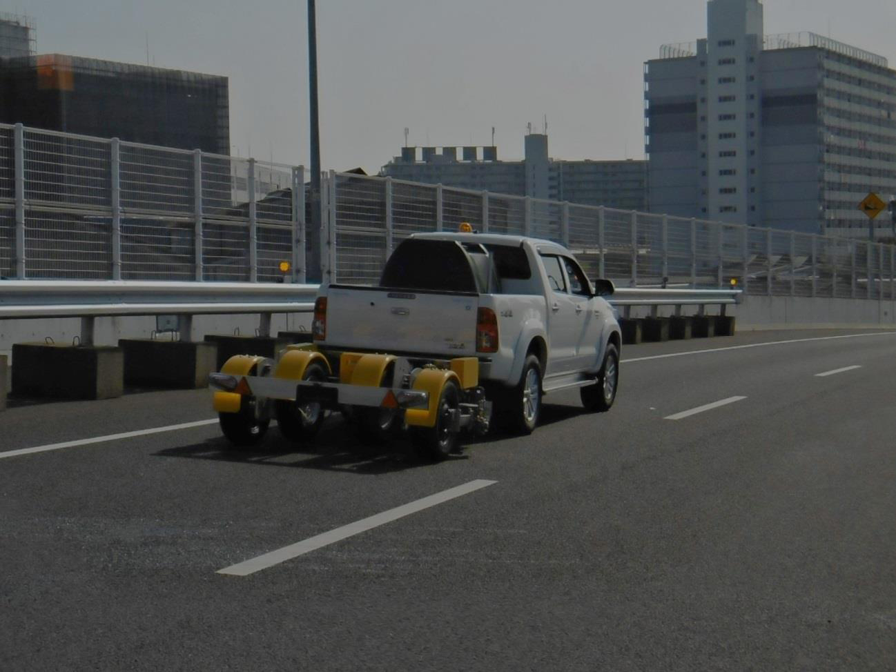 加えて車両でけん引して、専用のタイヤの回転状況から事故が起きやすいカーブの滑り抵抗値を的確に計測できる装置として、「連続路面滑り抵抗測定装置」を米国から輸入し、現在北海道の寒地土木研究所の技術協力を得て試験走行を重ねています。近々お目見えする予定です。
