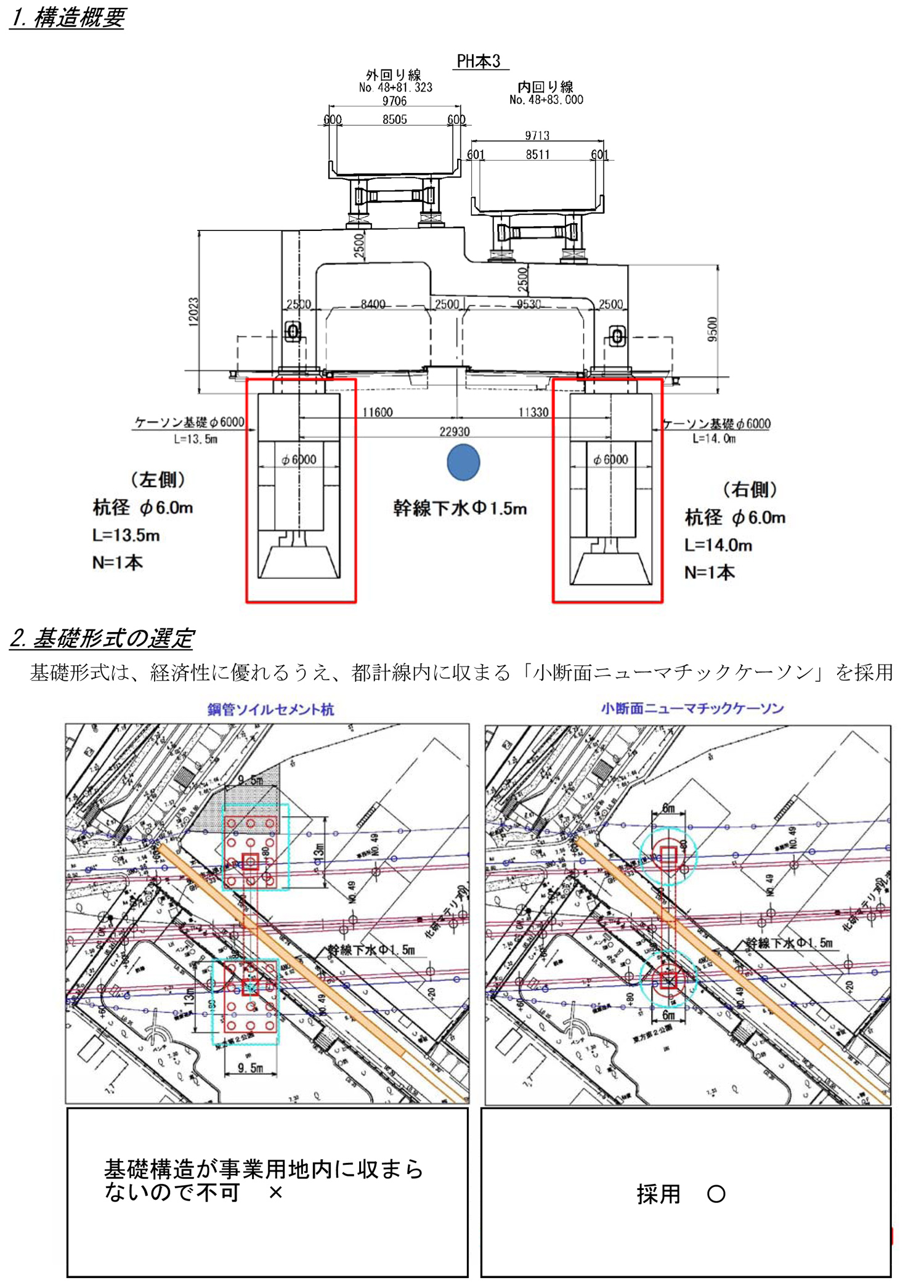中島 建設予定地には関連街路川向線の計画があり、その上に橋を架ける必要があります。川向線の道路内にはRC橋脚を立て込むほどのスペースが無く、鋼製橋脚を採用することにしました。同様の理由により、東方・川向地区の橋梁基礎には(構造上は杭基礎で足りるが)、既設構造物との取り合いの影響で杭基礎が採用できず、スリムケーソン工法を採用しています。