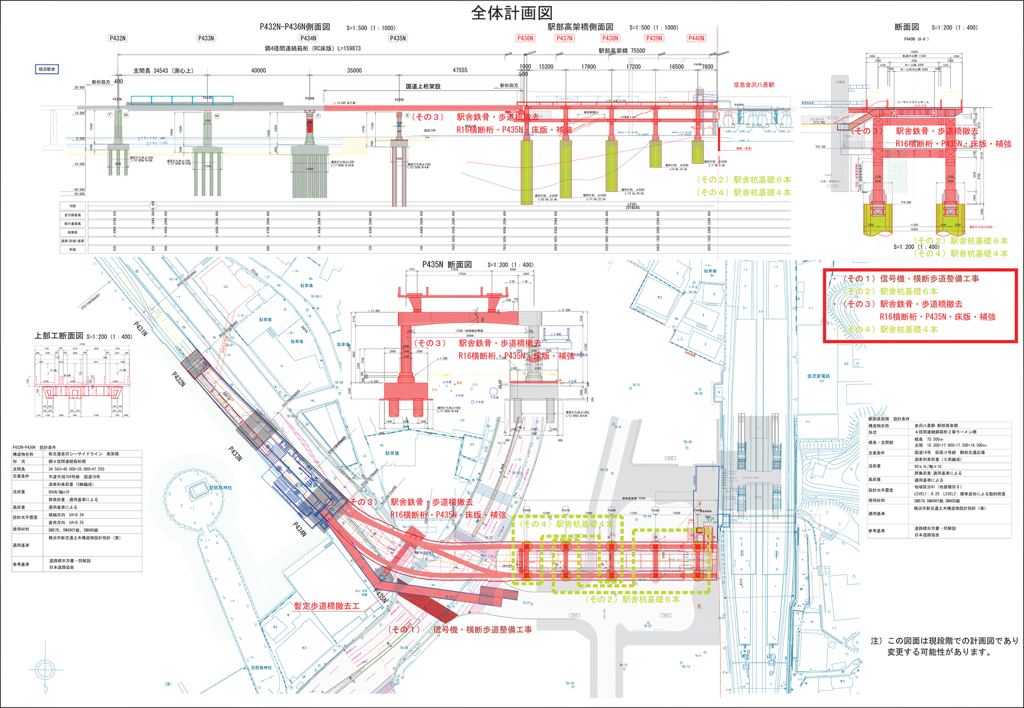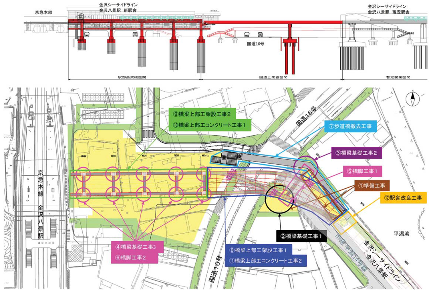 中島 金沢八景駅部が橋長75.5mの4径間連続鋼箱桁2層ラーメン構造、延伸高架部が約30mの鋼箱桁+約47.5mの鋼箱桁橋となっています。延伸高架部の海側は橋脚支点上ではなく、空中で桁をつなぐ方式になっており、47.5mの橋梁とも繋ぐことで既存桁と合わせて約160mの鋼4径間連続箱桁橋を形成する予定です。