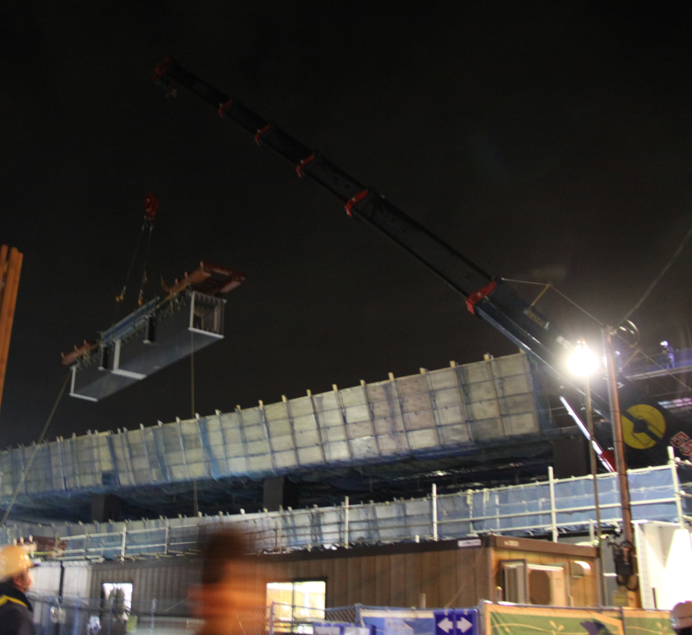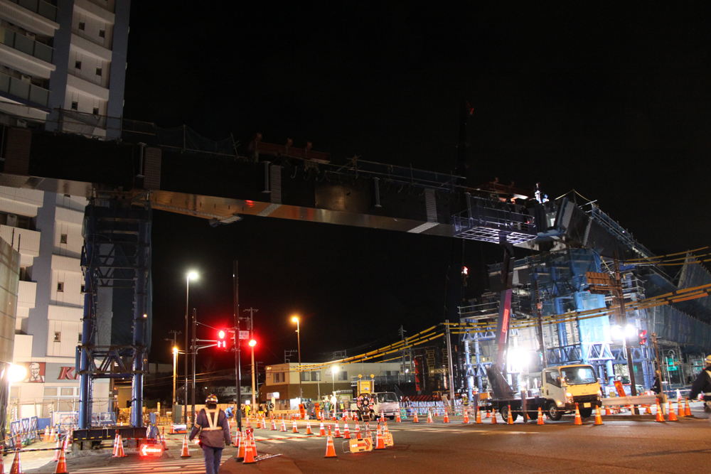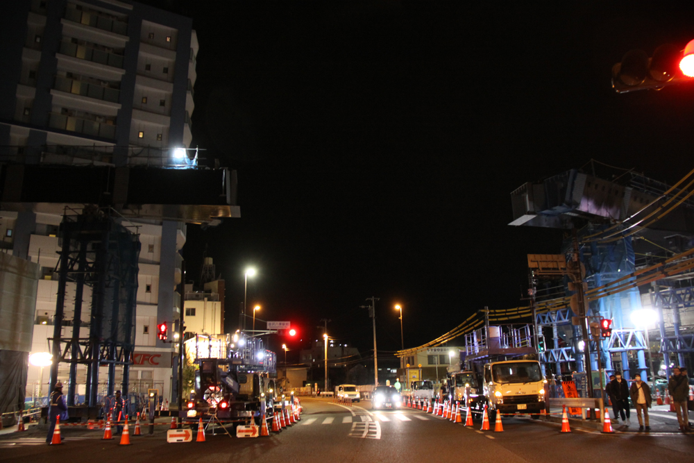 国道16号を夜間一時通行止めして跨道部の桁を架設