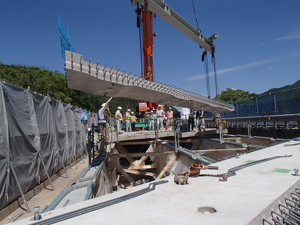 上部工では、高速道路各社が進める大規模更新事業で難工事にチャレンジしています。中央道の上長房橋では、集中工事としては初となる片車線規制による半断面床版取替を施工しています。同じく中央道の沢底川橋では国内で初めてPC連続合成桁を対象とした床版取替・床版増厚・PC外ケーブル補強の併用工法を実施しました。中国道の菅野川橋では斜角45°という厳しい条件下で、ほとんど現場打ちをすることなく高い品質を確保できるプレキャストパネルを設置することで床版を取り替えるといったミッションも達成しています。今後大規模更新事業は大ロット化が図られていく状況にありますが、中央道伊北IC付近の橋梁4本、トンネル2か所の大規模更新案件を熊谷組とのJVで受注することに成功しています。