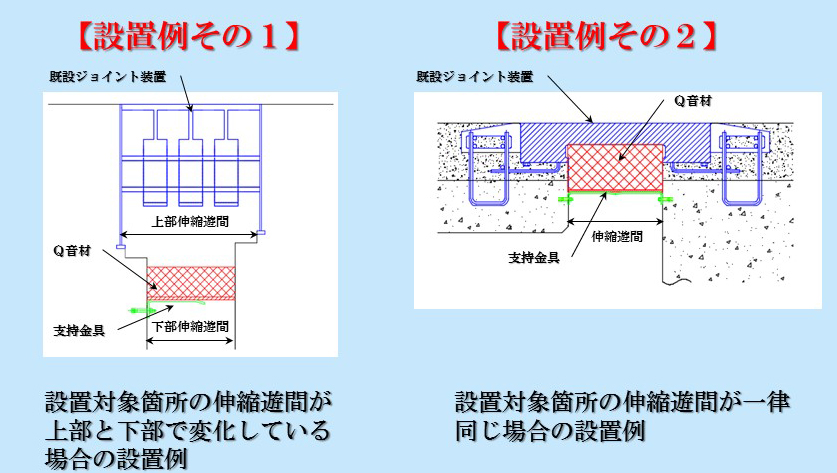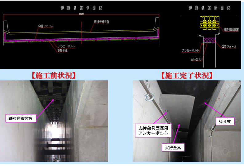 丸田 昨年から伸縮装置周辺から騒音対策の案件が増加しており、従来は特性の違う吸音シートと防音シートを組み合わせた複合シートを伸縮装置直下へ取り付けていました。この時は-5db程度の低減でした。しかしこれに満足せず、もっと効果のある材料を探していたところ、昨年、単体で吸音効果が高い材料を探し出して伸縮遊間下面へ取り付け、直下で-20dbの低減効果を確認しました。