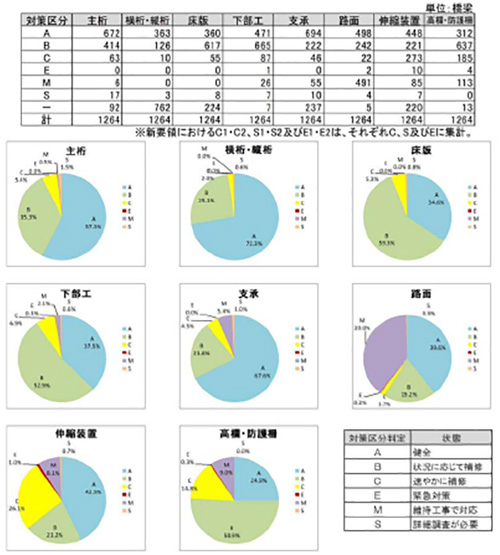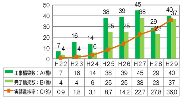 渡辺 現在の計画では、450橋を長寿命化する目標で、22年度から開始しています。450橋の選定基準は、橋梁の重要度と、遠方目視での点検結果に基づいたものです。28年度までに125橋が完了し、進捗率は27.8%となっています。26年に近接目視での点検結果が出て、判定区分Ⅲ以上は速やかな補修対象となりましたので、450橋以外の対象橋梁をどのようにするかを検討しています。