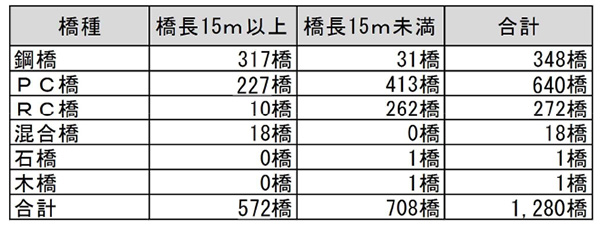 渡辺 管理している橋梁は1,280橋で、そのうち鋼橋348、PC橋640、RC橋272となります。また、橋長15m以上が572橋、15m未満が708橋です。
