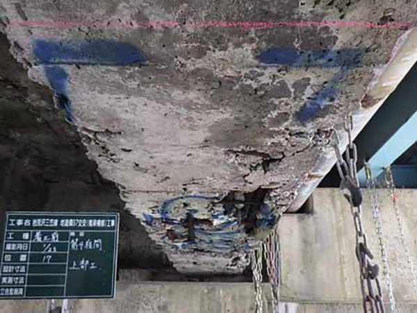 やはり、凍害、塩害の事象は多く、凍害で端部が欠けてボロボロになっている事例が多いです。鉄筋が露出している箇所に対しては補修をしています。とくに日本海側は陸地に向けて強い風が吹くこともあり、塩害が多く、20kmの範囲について対策が必要となっています。