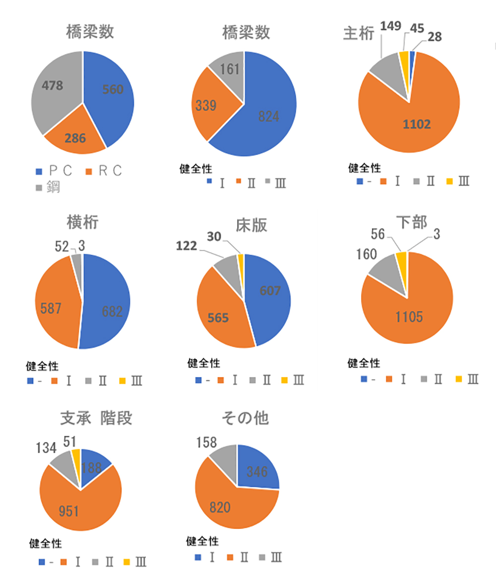 宮下 平成27年度の調査結果では、健全度Ⅰが824、Ⅱが339橋、Ⅲが161橋という結果となっています。健全度Ⅲは、橋種別では鋼が最も多く85橋、次いでPC橋(46橋)、RC橋(30橋)という順になっています。部位別では下部工、支承、横桁の順に多く損傷が見られています。(詳細は下表)