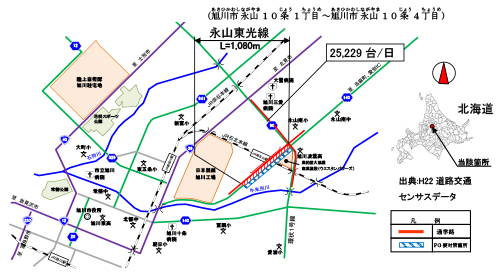 宮下 同路線は旭川市内中心部と当麻町を経由し愛別ICにアクセスする旭川都市圏の放射幹線街路です。周辺には小学校や高校が立地しており、本路線は永山南小学校の通学路に指定されています。しかし、JR石北本線踏切があることに加え、幅員狭小な片側歩道により車道を横断する回数が多くなっているほか、道北の有力企業である日本製紙旭川工場や、集約型大規模商業施設への物流ルートとなっていることから自動車交通量も多く、児童の安全性・利便性が確保されていない状況となっており、対策が急務となっています。