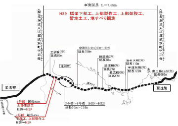 28年度までに用地補償、橋梁工及びトンネル工を実施しており、29年度は、用地補償、橋梁工及びトンネル工を実施する予定です。