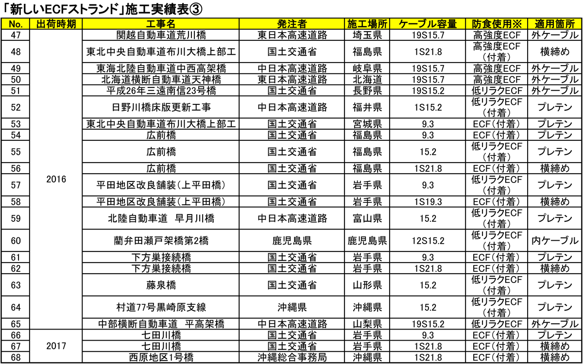 施工実績概要および防食仕様の種類(「新しい内部充てん型エポキシ樹脂被覆PC鋼より線「ECFストランド」に関する技術評価報告書」より抜粋、以下実績表も同)