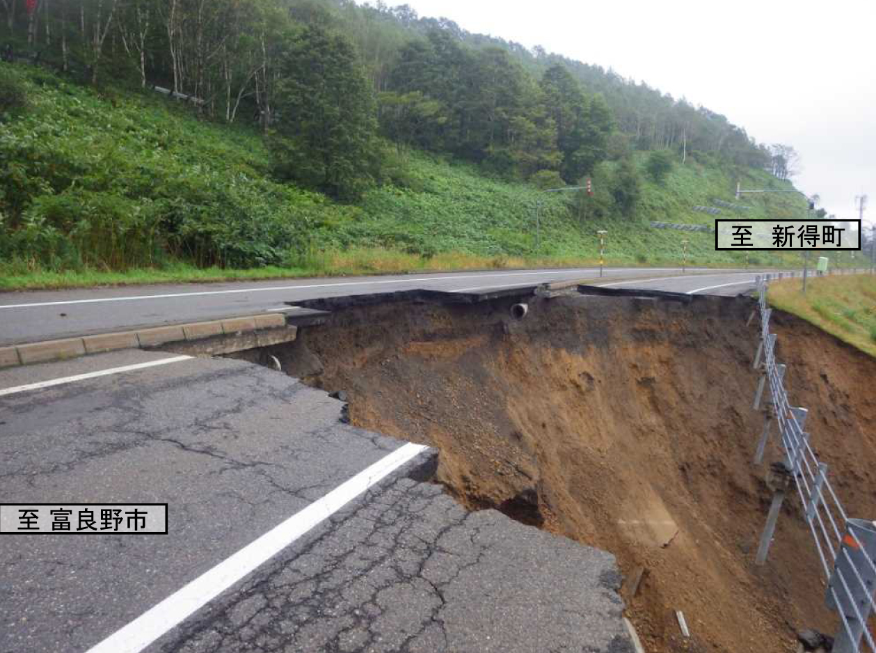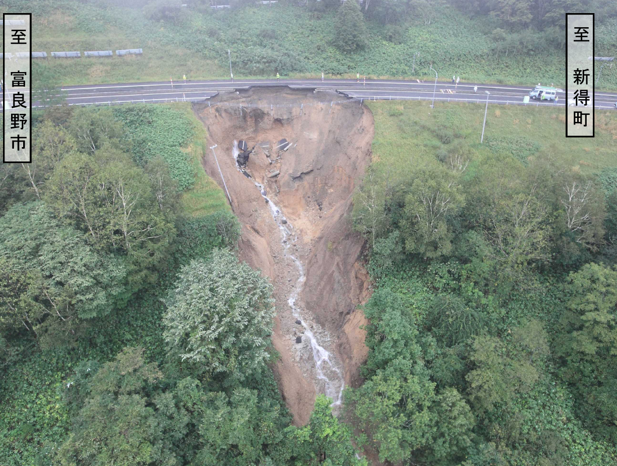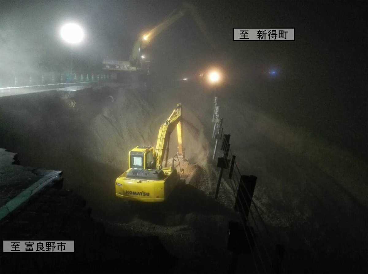 道東自動車道は大きな被害を生じたが、夜を徹して復旧作業を行い、一日で開けた