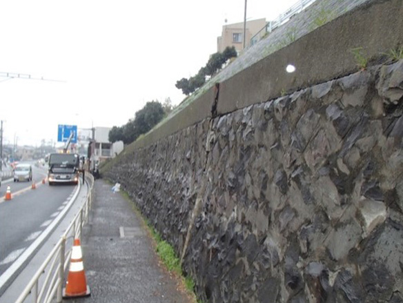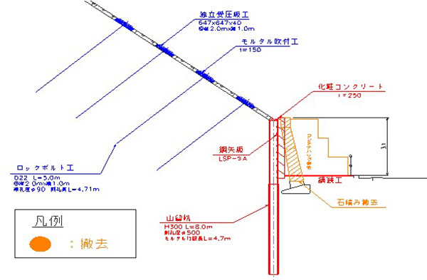 淡中 2年前に、国道1号二宮地区でのり面のブロックが下部の石積みを押して、石積みにひび割れが発生しました。応急対策として、平成27年3月に大型土のう282袋による石積み補強を行い、6月には最も安全度の低い6箇所をロックボルトで補強しました。のり面の安定をはかる本対策として、同年9月から12月にのり面上にモルタル吹付け、ロックボルト工(330箇所)を行い、のり尻部に土留工として山留杭(H-300@1.5m、L=8m)の打設を行うとともに、鋼矢板にて土留を行い、前面に化粧コンクリートを打設しました。
