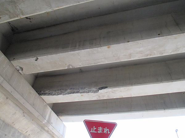 淡中 西湘バイパスの大磯西IC跨道橋(RC橋)で、潮風の浸透が原因と思われる塩害が発生しました。主桁部分にうきおよび鉄筋露出箇所があり、点検時にうきの範囲に進行があったので、平成27年度に断面修復などの補修を行っています。