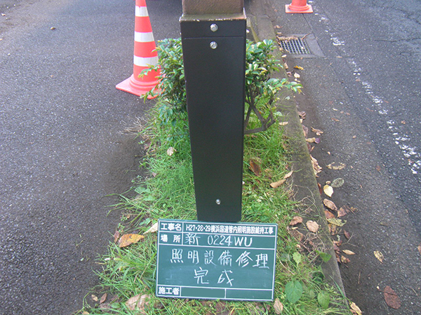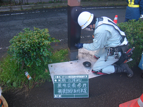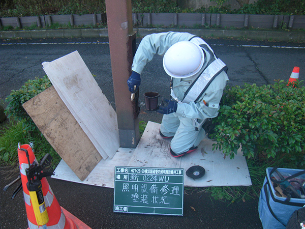 また、照明灯が腐食するケースがよくあります。根元の腐食は安全上、建替えが必要ですが、意外に多いのが開口部蓋の腐食です。蓋の突起部に水がたまり、そこが腐食するのです。これも建替えではなく開口部の補強部材を考案して、それで補修を行うというコスト削減を図った取り組みを行いました。さらに老朽化した照明灯の建替えで、対象の10mの照明柱を切断加工して再利用した上でLEDに取り替えるといった材料費の削減を目的として取り組みも行っています。