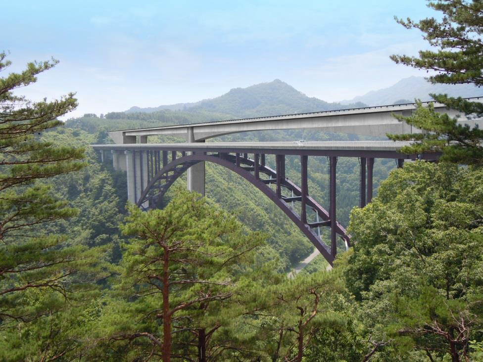 復興支援道路の最長橋梁は、相馬福島道路(霊山~福島)の桑折高架橋です。当該橋梁は橋長1,218mの鋼3+5+4+3+4径間連続箱桁です。