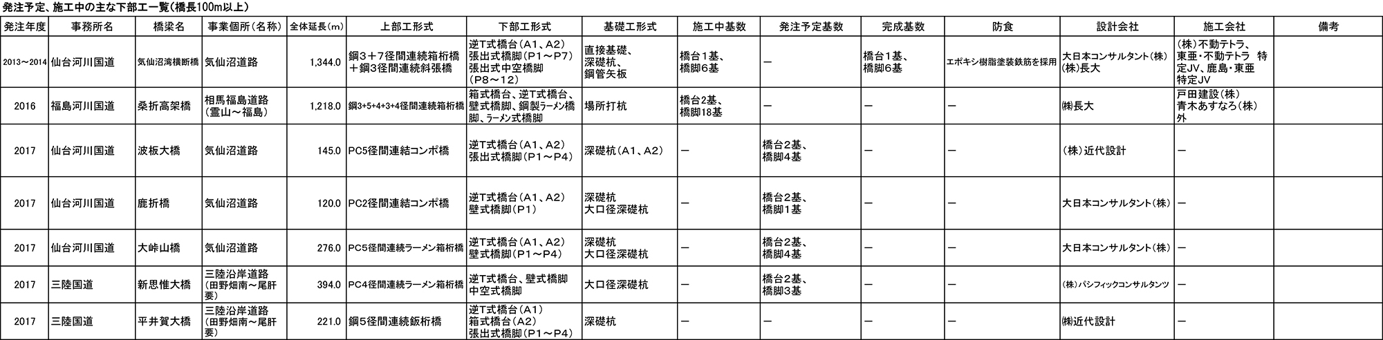 主な橋梁下部工着手橋梁一覧(拡大して見てください)