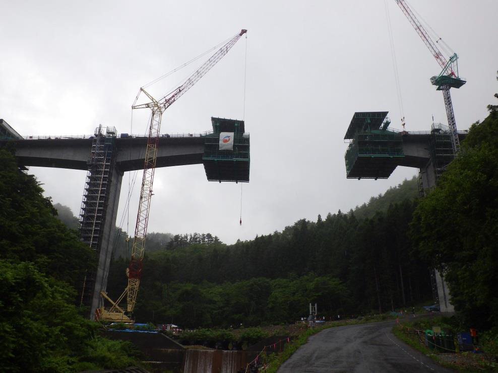 久慈北道路の夏井高架橋は、橋長497mのPC7径間連続ラーメン箱桁橋です。同橋も上下部一括発注で施工しており、本体工は29年度に完了予定で、30年度の開通予定です。