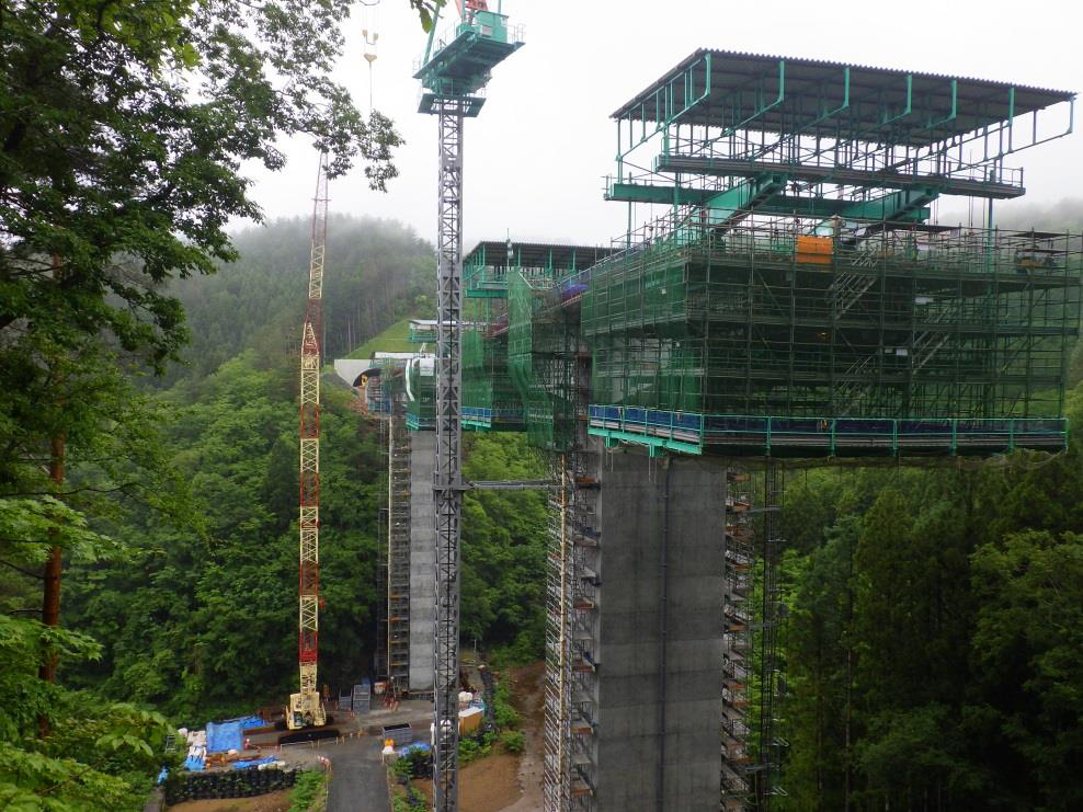 新思惟大橋は非常に深い渓谷に下部工を構築するため、橋脚高は最大で96mに達します。基礎は大口径深礎を予定しています。