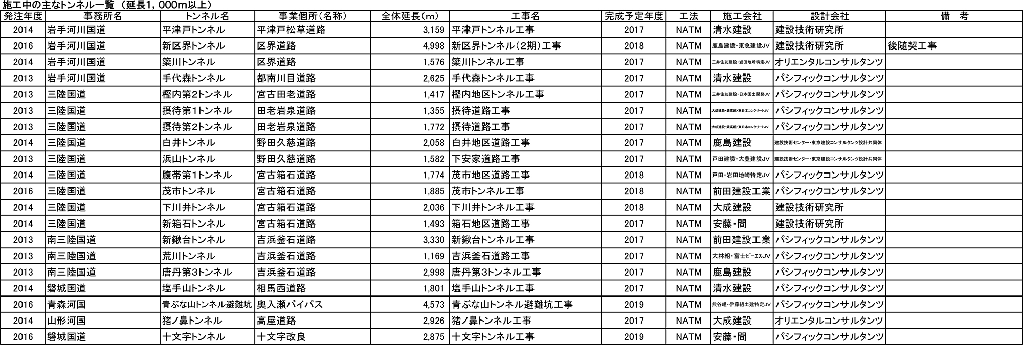 建設中の主要トンネル一覧