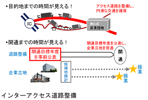 西成 圏央道の整備に合わせて企業立地が促進されましたが、高速道路のインターチェンジから20分程度の距離でないとなかなか企業立地をしていただけないことがあります。「インターアクセス道路整備」では、企業の予定を立てやすくするために開通目標年度を事前に公表し、高速道路のインターチェンジと産業団地などを結ぶアクセス道路を整備しています。「魅力UP! 時間が見えるインターアクセス道路整備」として、現在5路線5箇所を重点的に整備中です。