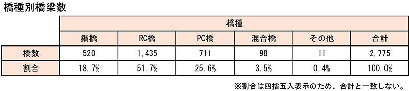 西成 橋梁は2,775橋(平成28年4月1日現在)で、車道橋が約9割の2,490橋で残りは側道橋となります。橋種別では約半分がRC橋で1,435橋、鋼橋は520橋(18.7%)、PC橋が711橋(25.6%)、混合橋が98橋(3.5%)、石橋などのその他が11橋(0.4%)となっています。