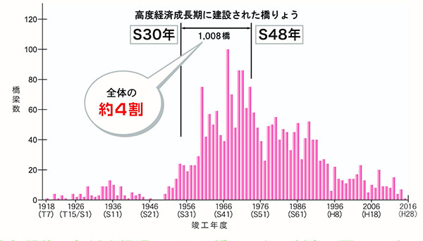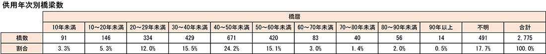供用年次別では、約4割が供用開始後50年を経過していて、高度経済成長期(供用開始後40~60年)のものが約4割で、今後20年で50年を経過する橋梁が8割に達します。延長別では、15m未満が約6割で1,771橋、100m以上の長大橋が212橋(7.6%)あります。
