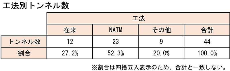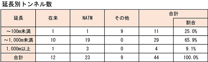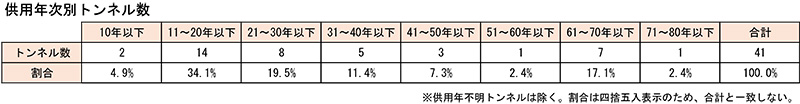西成 全体で44箇所あり、NATM工法が約半分の23箇所、在来工法が12箇所、素掘り工法などのその他9箇所となっています。供用年次別では、約2割が50年を経過していて、高度経済成長期のものが4箇所、今後20年で50年を経過するトンネルは40.6%となっています。延長別では、1kmを超えるトンネルは4箇所あります。