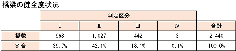 西成 橋梁では、措置が必要な判定区分Ⅲ(早期措置段階)とⅣ(緊急措置段階)は全体の約2割でした。残りの8割は、健全または予防保全段階(判定区分ⅠとⅡ)です。緊急輸送道路で判定区分ⅢとⅣのものは2割以下となっています。緊急措置段階と判定された橋梁はすべて対策完了済みです。