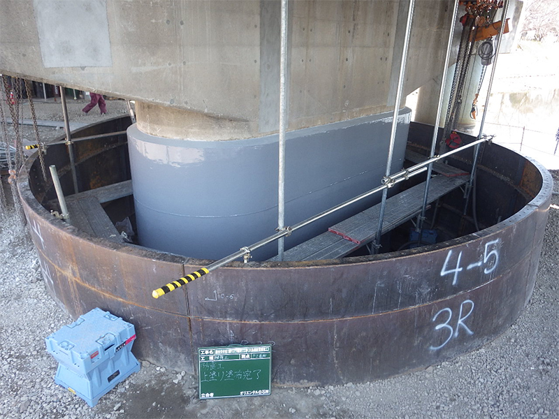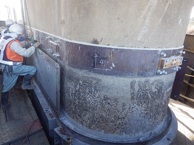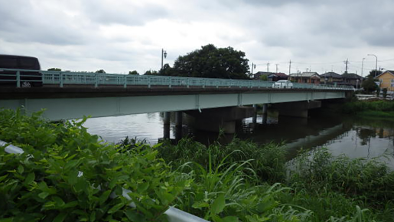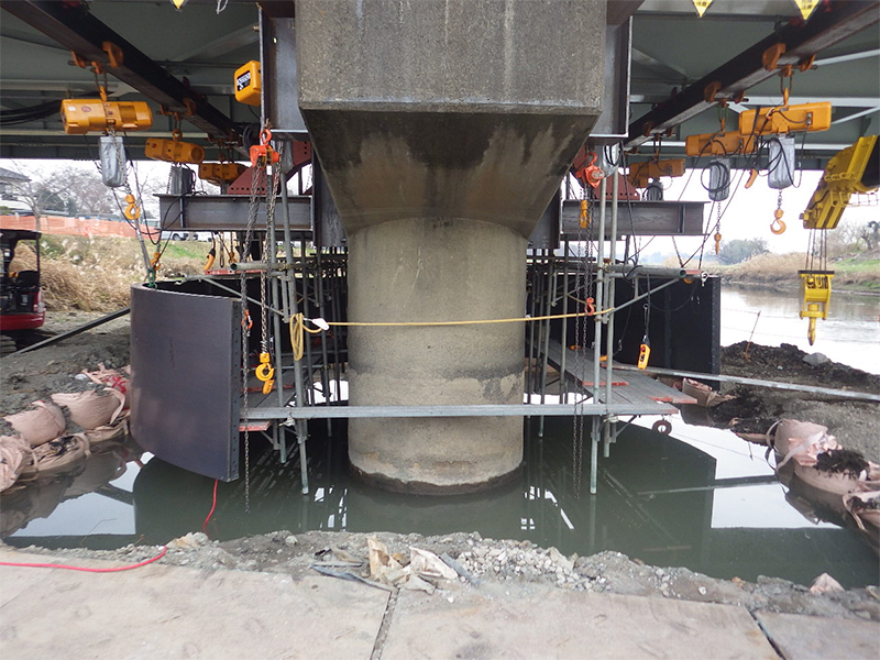 元荒川を渡河する県道154号・川島橋(橋長72.1m、幅員8.0m、3径間単純合成鈑桁橋)では、平成28年度に耐震補強工事を行いました。橋脚(P2)補強工では、オリエンタル白石が開発したピア-リフレ工法を採用して、圧入鋼板巻き立てを行い、A2、P3に落橋防止装置の設置をしています。