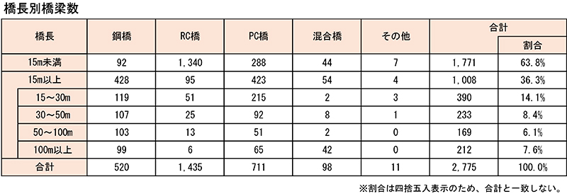 種類別では、15m未満の橋梁のうちRC橋の比率が75.6%と高くなっていて、15m以上では鋼橋とPC橋がそれぞれ約4割となっています。鋼橋では30m以上で50.3%と比率が高く、PC橋では橋長15~30mで55.1%です。
