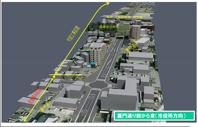 小島 町谷本太線は、市南部地域の東西方向道路が脆弱であり、国道17号と国道17号バイパスの連結路確保を目的とした街路整備事業です。延長4km、計画幅員16mの2車線道路となります。そのうちの766mを鴻沼工区として事業を進めていて、進捗率は28年度末時点で96%となっており、今年度末までに供用を開始します。27.4mと12mの橋梁2橋、127.5mのトンネル1本(箱型函渠)があります。