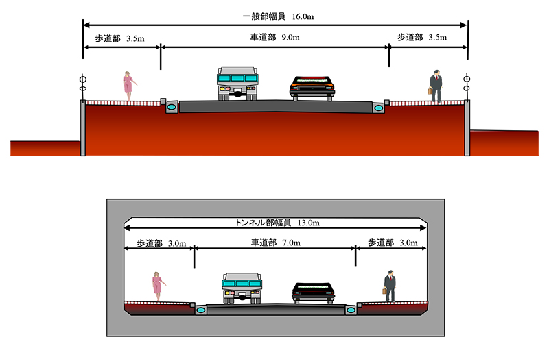 (左)(都)町谷本太線(鴻沼工区)完成予想図/(右)標準横断図