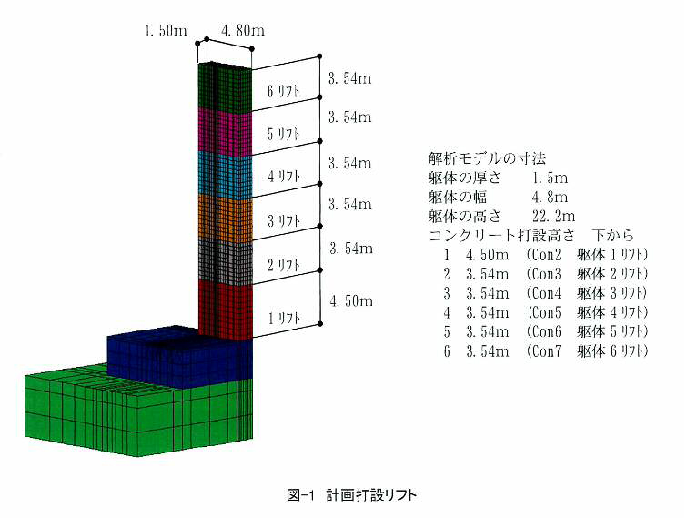 部材厚さが3mを超えるマスコンクリートであったため、FEM解析を行いました。その結果を受けて、ひび割れ抑制鉄筋の適切な鉄筋量の検討や膨張材の添加の要否の検討を行いました。具体的には、橋脚の柱を現場打ちする際、第2リフト部の施工条件を膨張材有、ひび割れ抑制鉄筋無で施工を行った結果、鉛直方向に0.04mm幅と僅かですが微細なひび割れが生じました。これにより膨張材を投入し、打設温度も抑制しましたが、それだけでは、ひび割れが十分に抑制できないので、ひび割れ抑制鉄筋が必要であることが判りました。