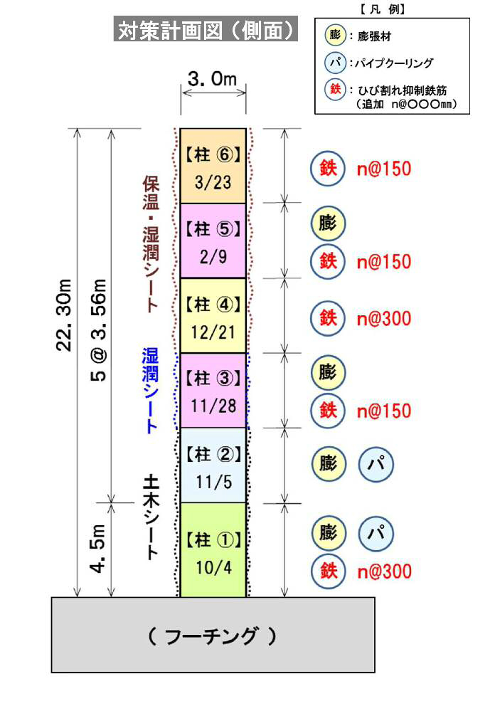 また、ひび割れ抑制鉄筋を現場に合わせていろいろパターン化しています。いずれの温度解析でもひび割れが発生するということでしたので、膨張材をミックスして、それを入れる、入れない、あるいはひび割れ抑制鉄筋のピッチを150や300に変えたりしています。