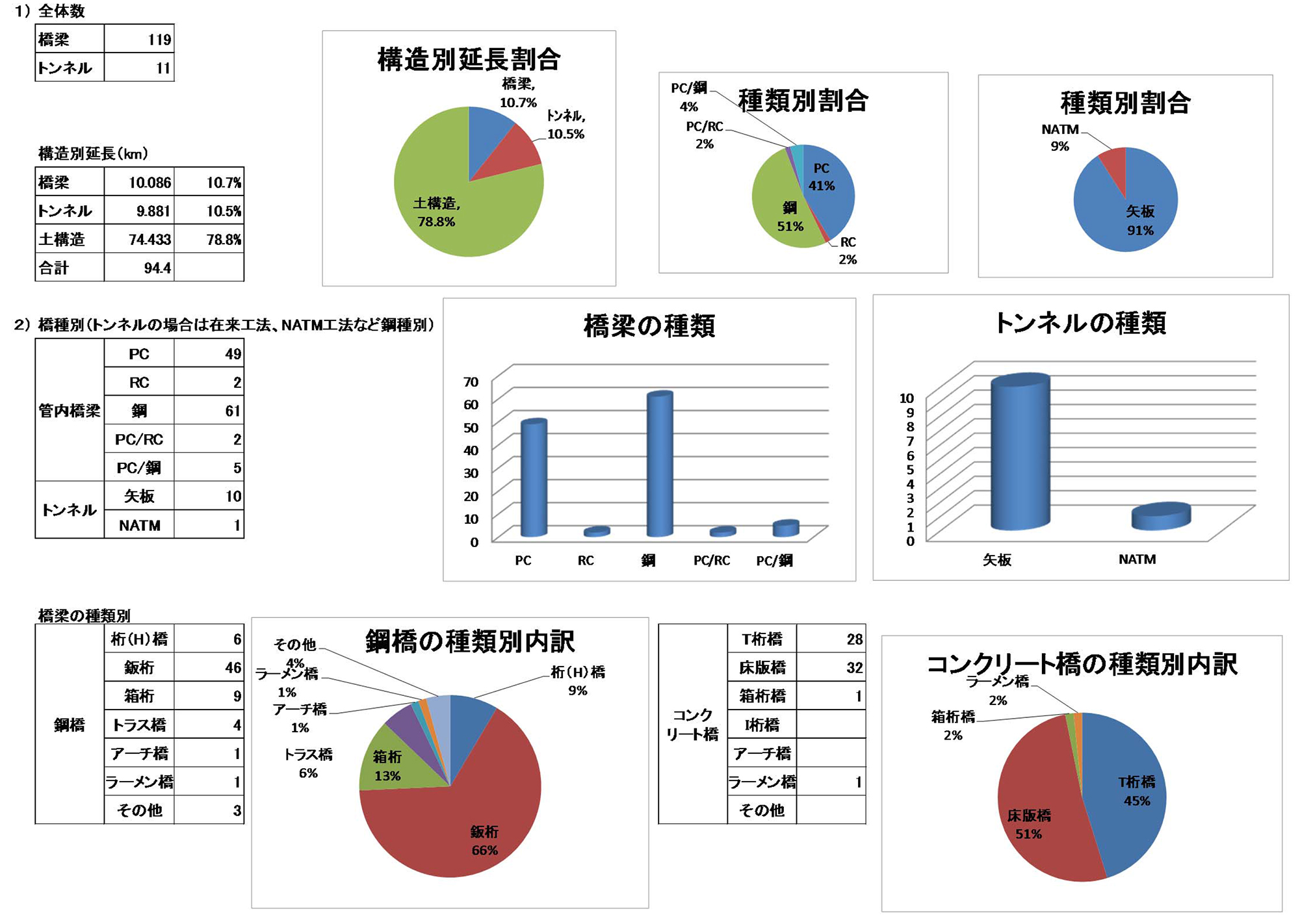 管内の構造別内訳、橋種別内訳、トンネルの工法種別内訳