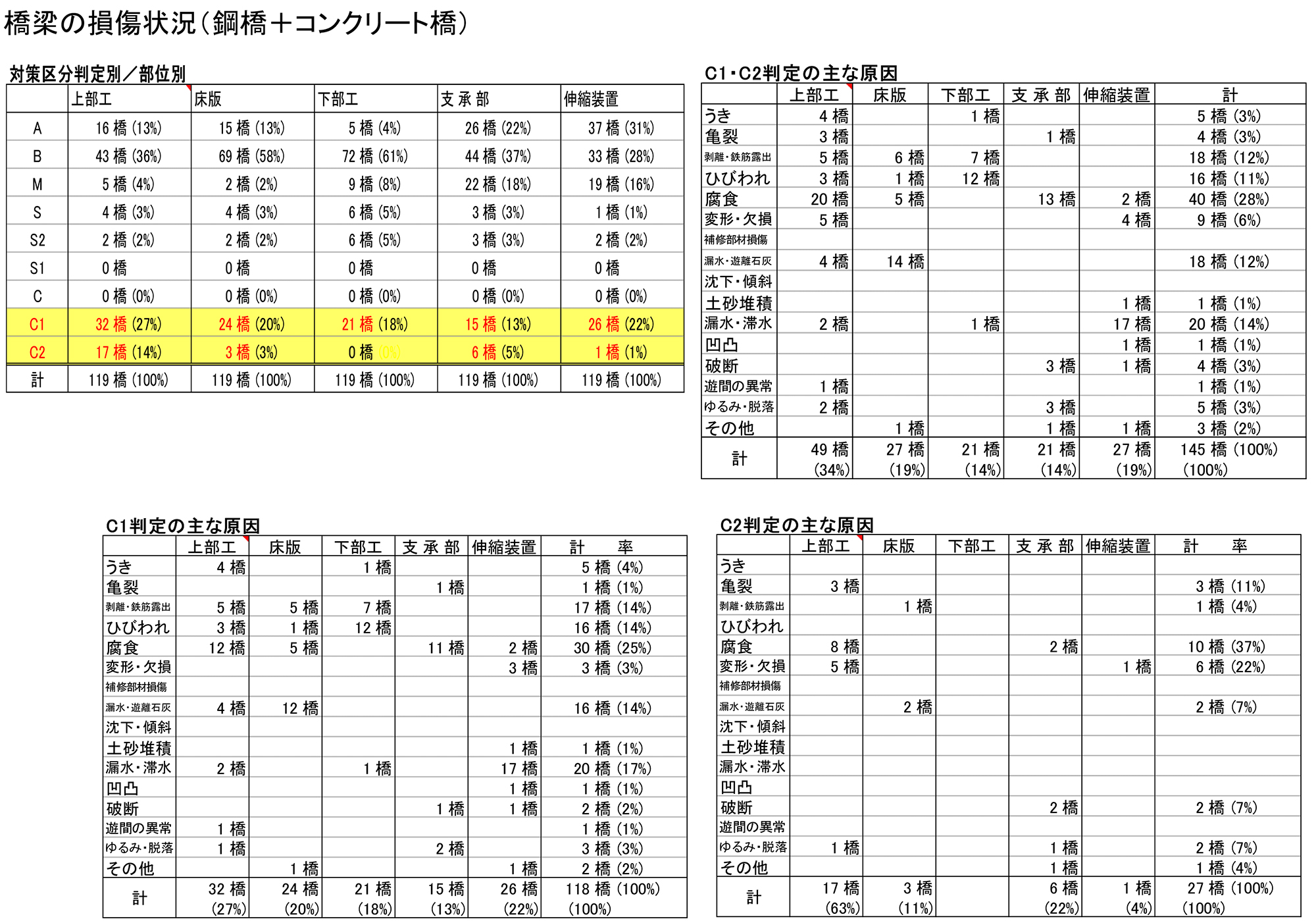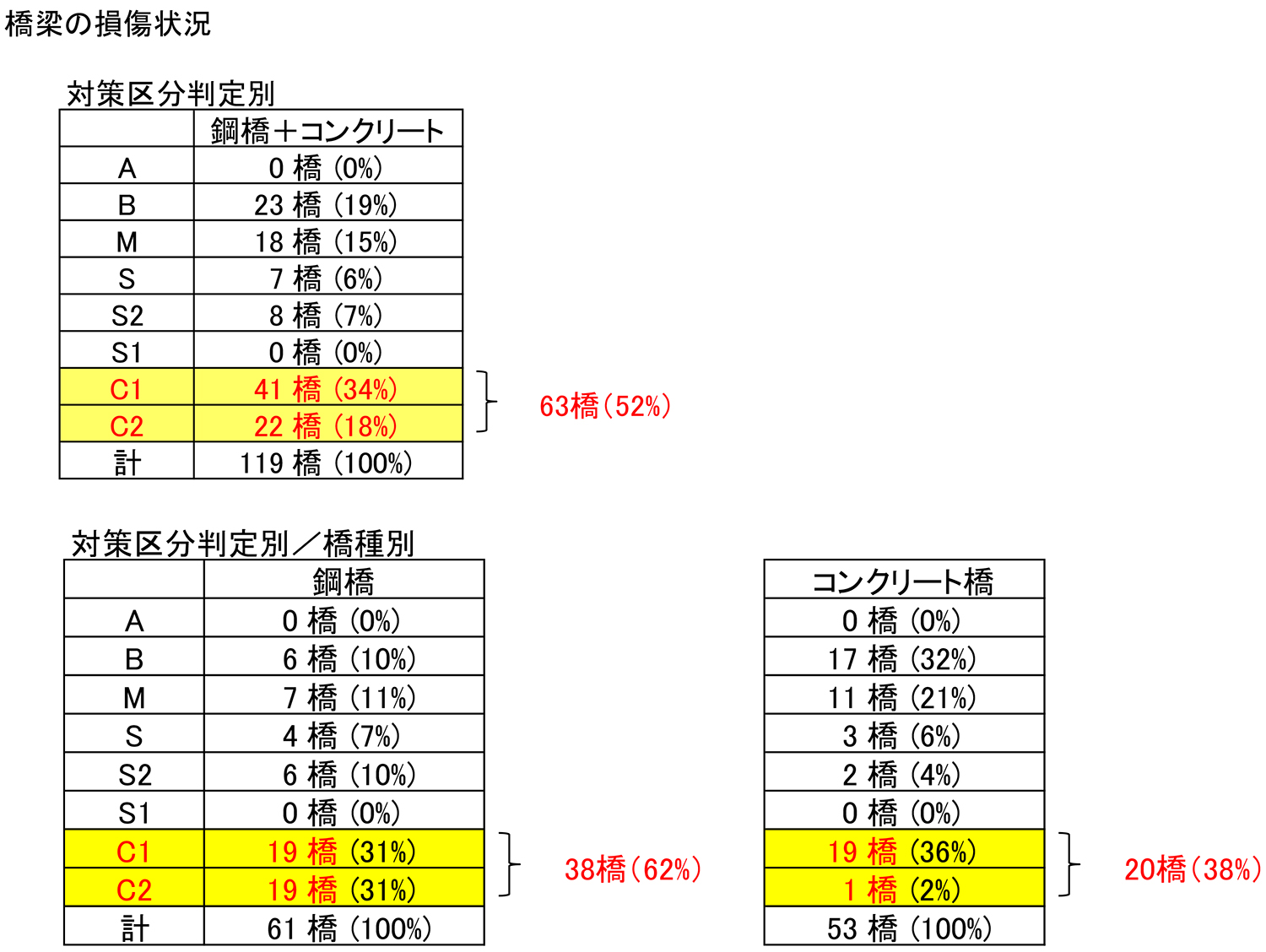 橋種別では、C判定が鋼橋38橋で約6割、コンクリート橋20橋で約4割です。凍結抑制剤を冬に撒いていますので、その漏水、主桁への付着からの腐食と、主桁、とくに桁端の損傷が大きくなっています。損傷内容は、水回りを中心とした腐食が多くなっています。