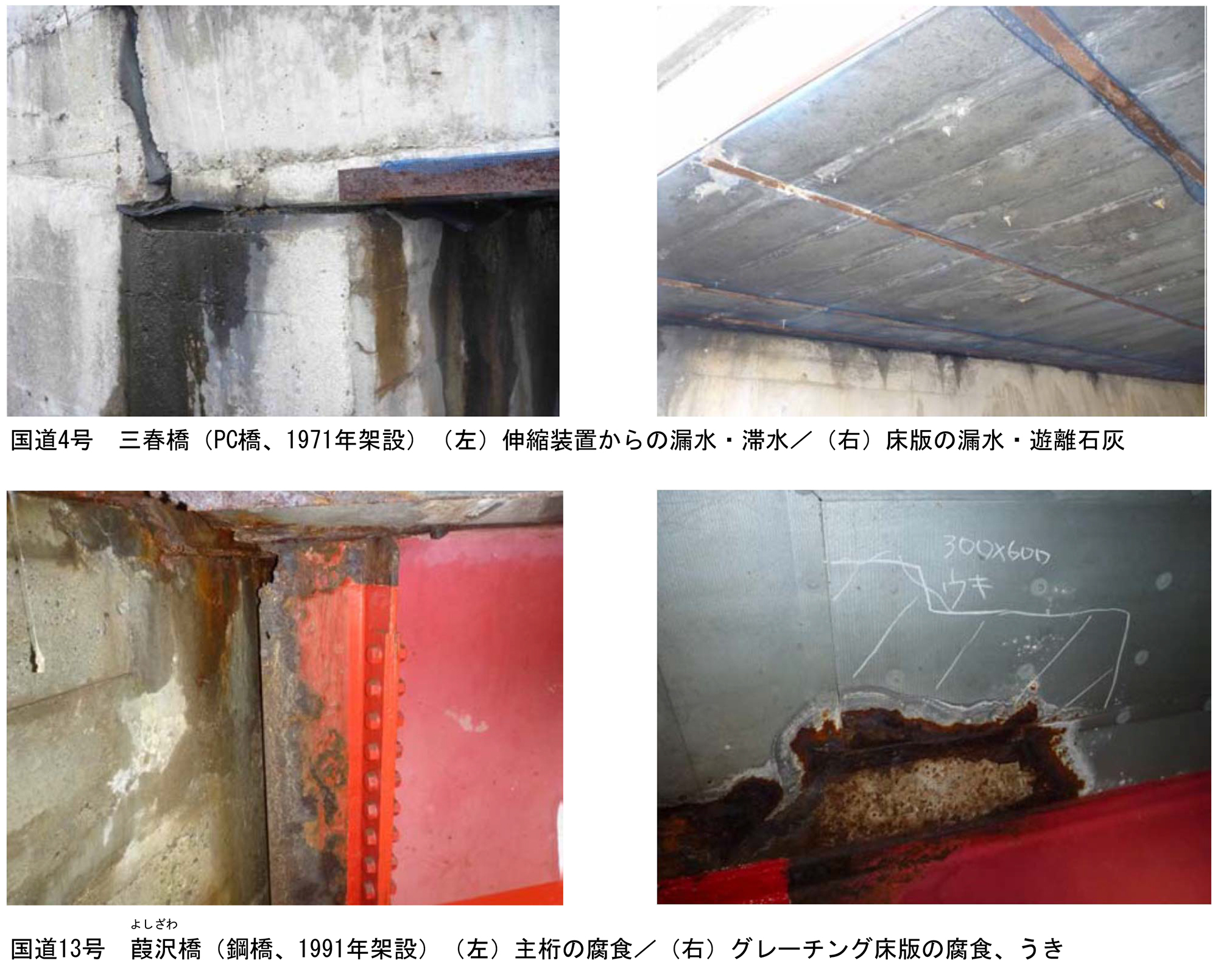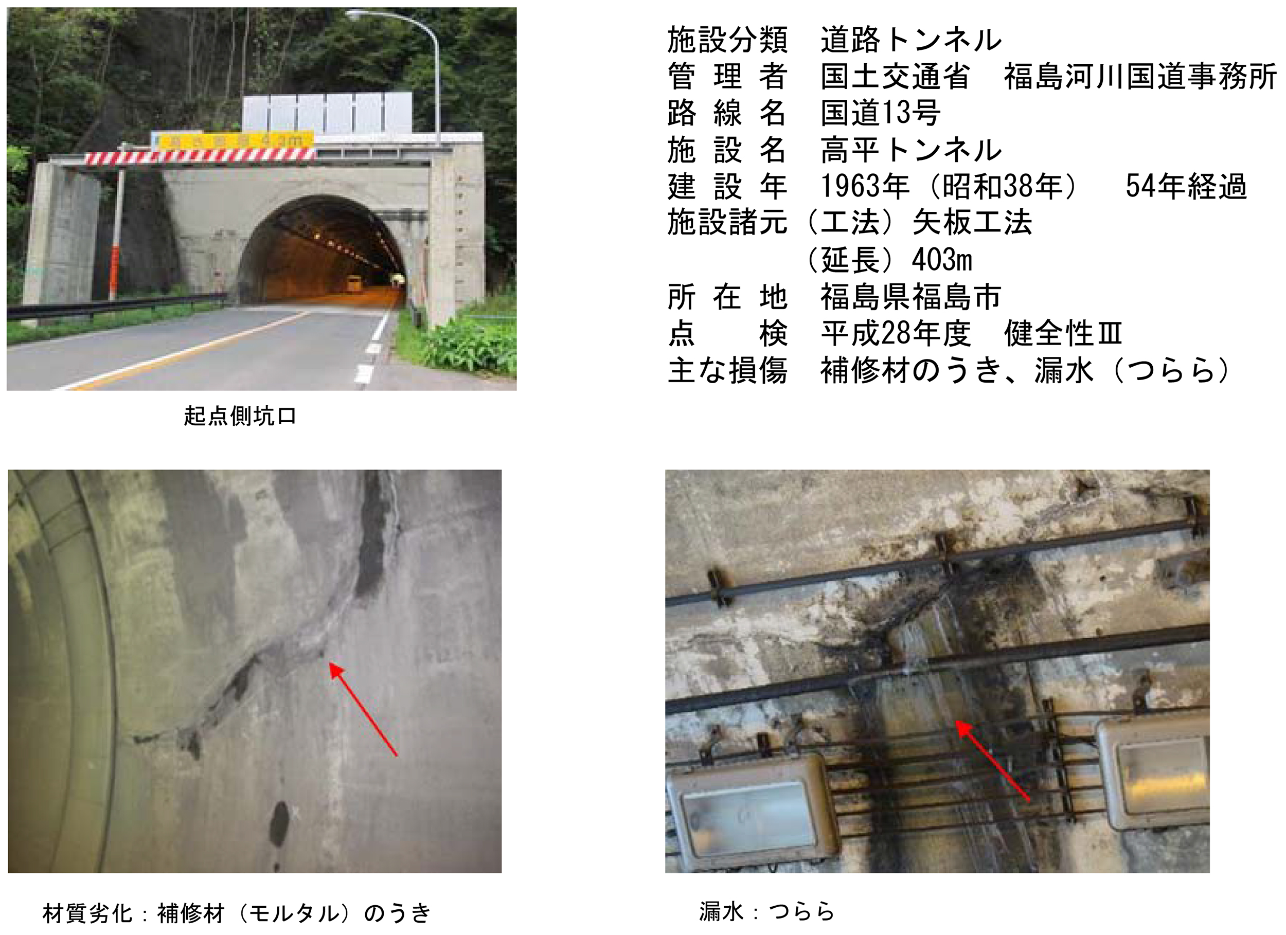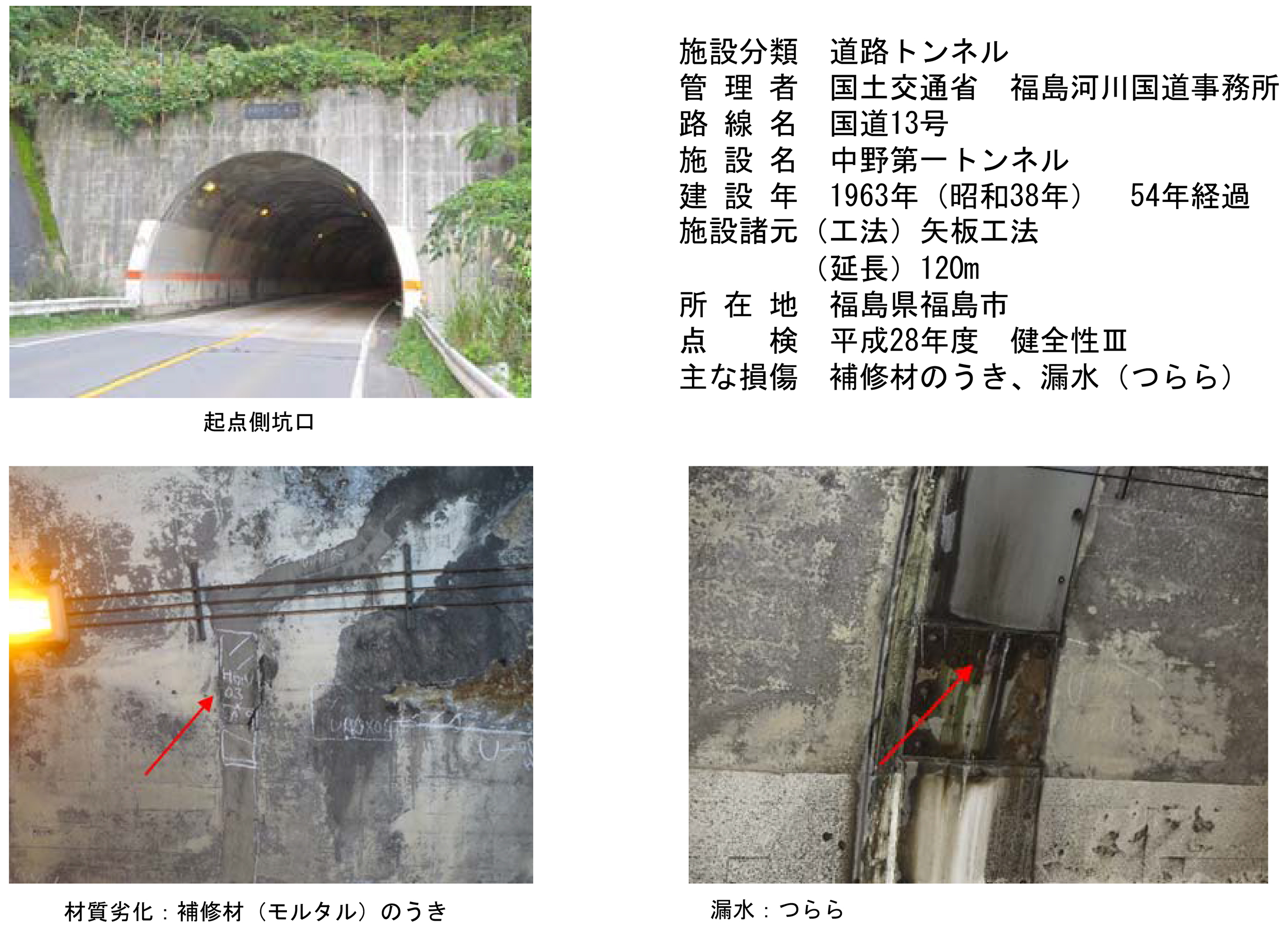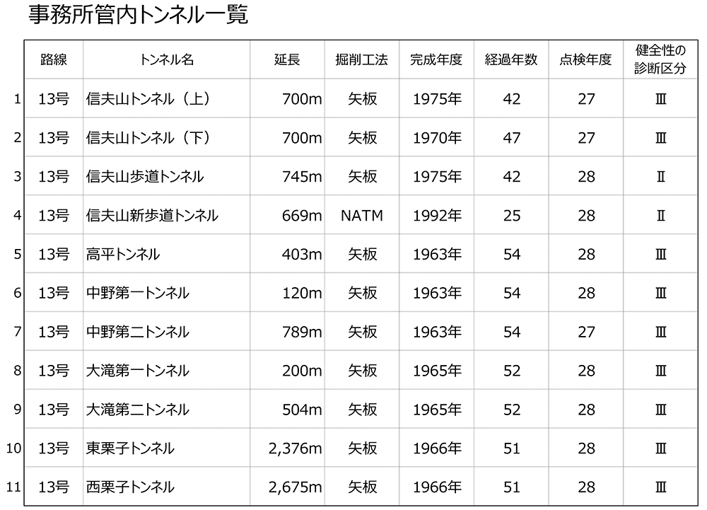トンネルについては、11箇所全て国道13号上にあります。そのうち7箇所は山形県境側の山岳部、昔、萬世大路と呼ばれた区間にあり、信夫山はJR福島駅の北側にあります。信夫山新歩道トンネルを除きすべて在来矢板工法で建設されており、老朽化による損傷が目立ってきています(健全性Ⅲが9トンネル)。各トンネルについて過去に各種の補修を行っていますが、以前の補修箇所や漏水対策箇所にモルタルの浮きや漏水などの損傷が見られています。